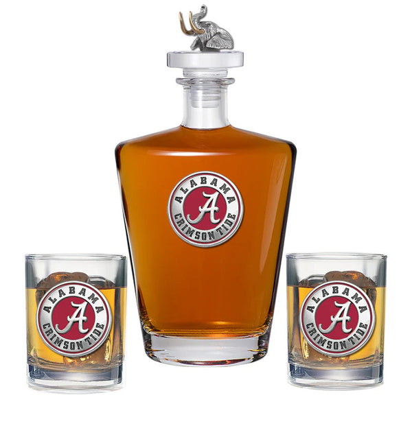 This is a set of a 25-ounce glass decanter with a fine pewter casting, 3D Topper, and two Double Old Fashioned Glasses. A great addition to any home bar! Made in USA.