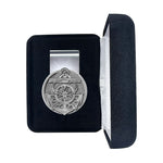 This money clip is made with super spring steel. It will hold one bill or a giant stack! The best looking and functioning clip you will ever own! The fine pewter detail is intricate. Comes with a velour hinged gift box. Made in USA.