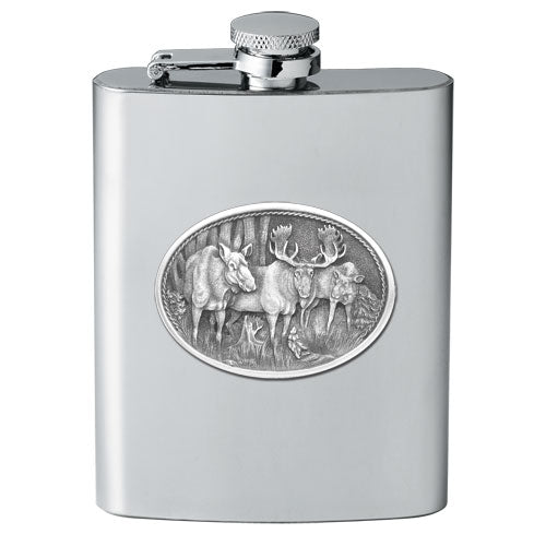 This 8 ounce stainless steel flask is embellished with a fine pewter casting. Assembled in USA.