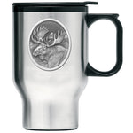 This double wall stainless steel travel mug is insulated and it is stainless inside and out. It is embellished with a fine pewter decorative casting. The lid has a non-spill...