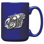 This coffee mug is decorated with a fine pewter casting. It is microwaveable and dishwasher safe with no heat cycle.. The glass coffee mug is 16 ounces, and the ceramic coffee mug is 15 ounces.