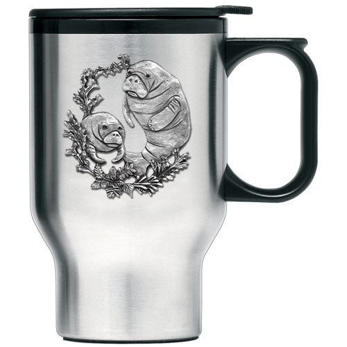 This double wall stainless steel travel mug is insulated and it is stainless inside and out. It is embellished with a fine pewter decorative casting. The lid has a non-spill...