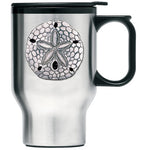 This double wall stainless steel travel mug is insulated and it is stainless inside and out. It is embellished with a fine pewter decorative casting. The lid has a non-spill...