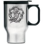 This double wall stainless steel travel mug is insulated and it is stainless inside and out. It is embellished with a fine pewter decorative casting. The lid has a non-spill...