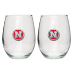 This is a set of two 12 ounce glass goblets with a fine pewter logo medallion bonded to the side. It could be used to serve water, wine or other beverages. Made in USA.