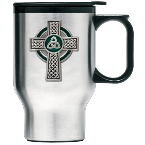 This double wall stainless steel travel mug is insulated and it is stainless inside and out. It is embellished with a fine pewter decorative casting. The lid has a non-spill feature.