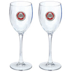 This is a set of two 12 ounce glass goblets with a fine pewter logo medallion bonded to the side. It could be used to serve water, wine or other beverages. Made in USA.