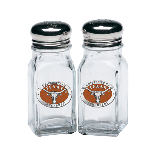 This is a set of salt & pepper shakers with a fine pewter logo medallion bonded to the side. Made in USA.