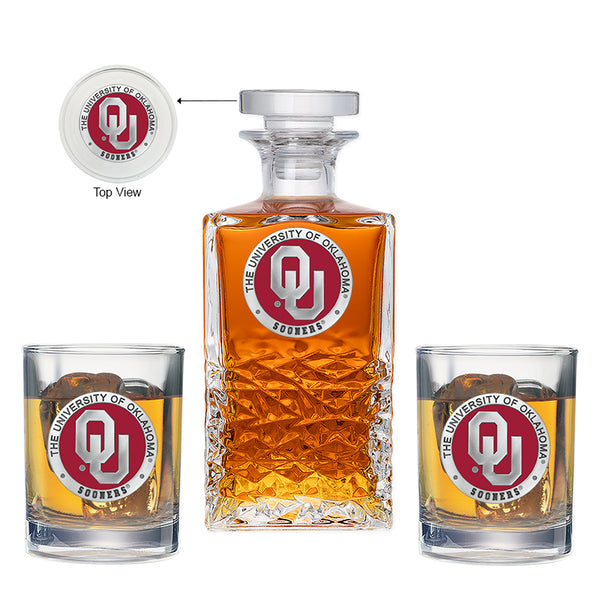 This 25-ounce glass decanter is embellished with a fine pewter casting matched with two Double Old Fashioned Glasses. A great addition to any home bar! Made in USA.