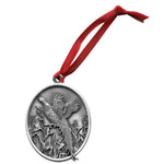 This fine pewter ornament is detailed on both sides. It comes with satin ribbon and in a window package. Use it on your tree, car mirror, or other applications! Made in USA.