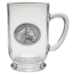 This coffee mug is decorated with a fine pewter casting. It is microwaveable and dishwasher safe with no heat cycle.. The glass coffee mug is 16 ounces, and the ceramic coffee mug is 15 ounces.