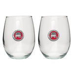 This is a set of two 12 ounce glass goblets with a fine pewter logo medallion bonded to the side. It could be used to serve water, wine or other beverages. Made in USA.