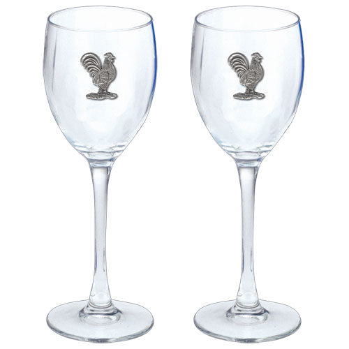 This is a set of two 12 ounce glass goblets with a fine pewter logo medallion bonded to the side. It could be used to serve water, wine or other beverages. Made in USA.
