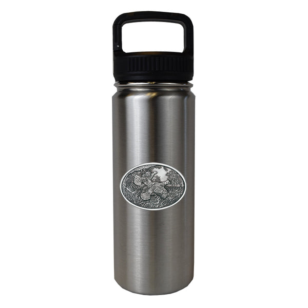 This 27 oz (800 mil) double wall stainless steel thermos is insulated and it is stainless inside and out. It is embellished with a fine pewter decorative casting. The lid has a screw on lid with a handle for easy transport.Heritage Pewter has been hand-crafting fine pewter gifts since 1988. We offer an array of pewter products, ranging from barware to wind chimes, golf clubs to coffee mugs.