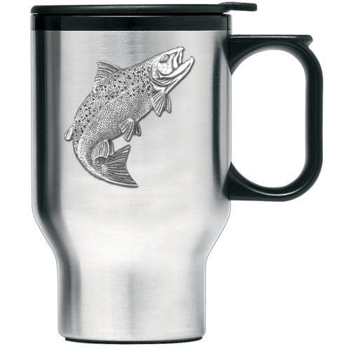 This double wall stainless steel travel mug is insulated and it is stainless inside and out. It is embellished with a fine pewter decorative casting. The lid has a non-spill feature.