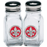 This is a set of salt & pepper shakers with a fine pewter logo medallion bonded to the side. Made in USA.