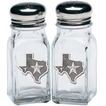 This is a set of salt & pepper shakers with a fine pewter logo medallion bonded to the side. Made in USA.