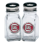 This is a set of salt & pepper shakers with a fine pewter logo medallion bonded to the side. Made in USA.