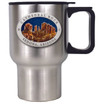 This double wall stainless steel travel mug is insulated and it is stainless inside and out. It is embellished with a fine pewter decorative casting. The lid has a non-spill feature.