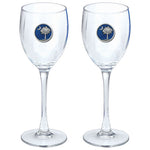 This is a set of two 12 ounce glass goblets with a fine pewter logo medallion bonded to the side. It could be used to serve water, wine or other beverages. Made in USA.