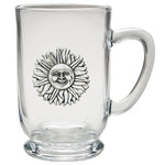 This coffee mug is decorated with a fine pewter casting. It is microwaveable and dishwasher safe with no heat cycle.. The glass coffee mug is 16 ounces, and the ceramic coffee mug is 15 ounces.