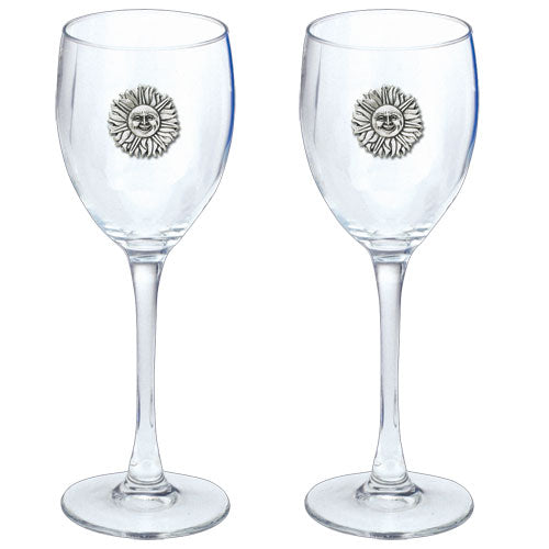This is a set of two 12 ounce glass goblets with a fine pewter logo medallion bonded to the side. It could be used to serve water, wine or other beverages. Made in USA.