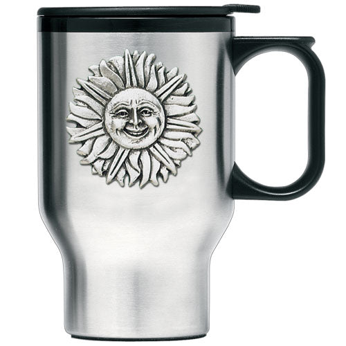 This double wall stainless steel travel mug is insulated and it is stainless inside and out. It is embellished with a fine pewter decorative casting. The lid has a non-spill...