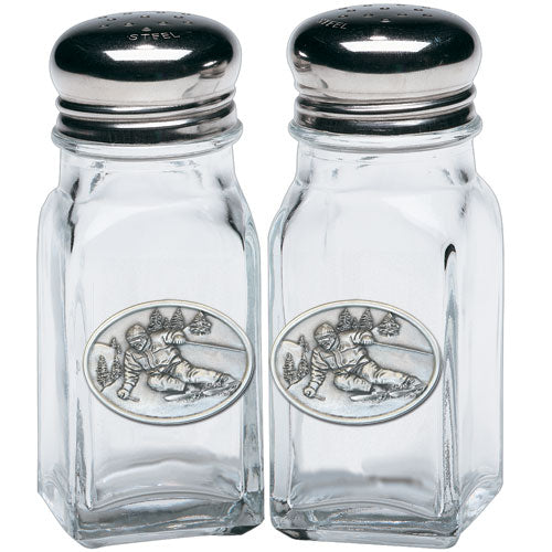 This is a set of salt & pepper shakers with a fine pewter logo medallion bonded to the side. Made in USA.
