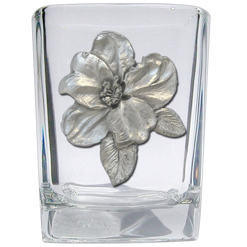 This 1.5 ounce square shot glass is highlighted with a fine pewter casting. Made in USA.