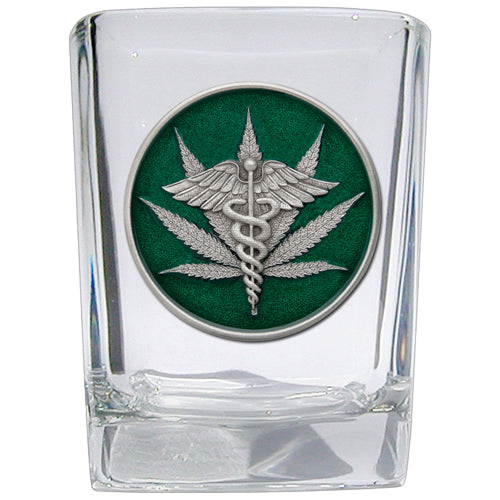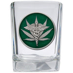 This 1.5 ounce square shot glass is highlighted with a fine pewter casting. Made in USA.