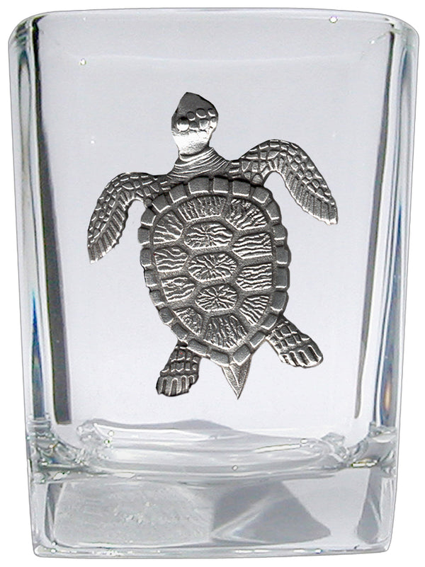This 1.5 ounce square shot glass is highlighted with a fine pewter casting. Made in USA.