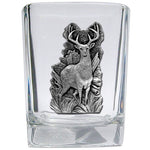 This 1.5 ounce square shot glass is highlighted with a fine pewter casting. Made in USA.