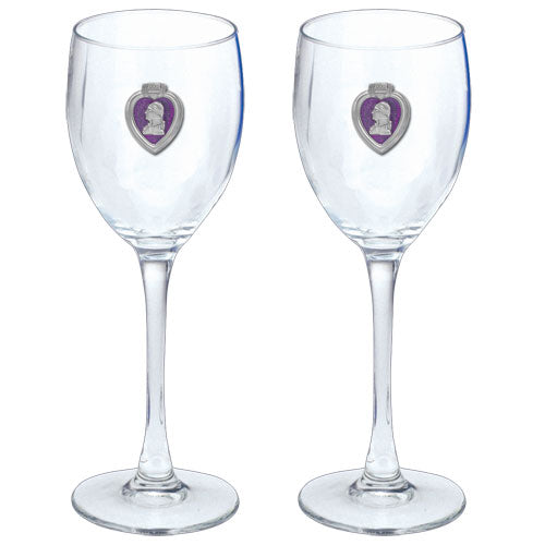 This is a set of two 12 ounce glass goblets with a fine pewter logo medallion bonded to the side. It could be used to serve water, wine or other beverages. Made in USA.