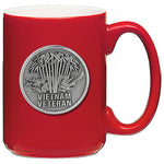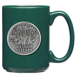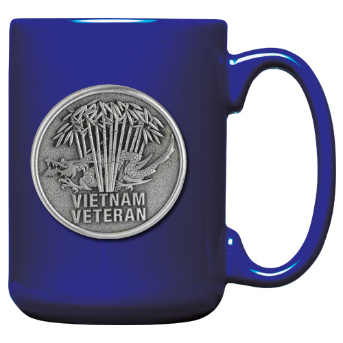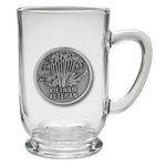 This coffee mug is decorated with a fine pewter casting. It is microwaveable and dishwasher safe with no heat cycle.. The glass coffee mug is 16 ounces, and the ceramic coffee mug is 15 ounces.