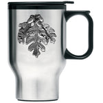 This double wall stainless steel travel mug is insulated and it is stainless inside and out. It is embellished with a fine pewter decorative casting. The lid has a non-spill...