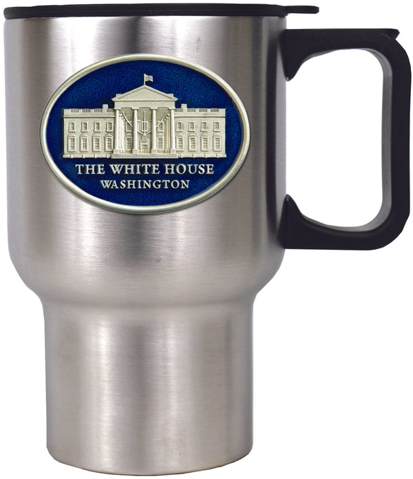 This double wall stainless steel travel mug is insulated and it is stainless inside and out. It is embellished with a fine pewter decorative casting. The lid has a non-spill...