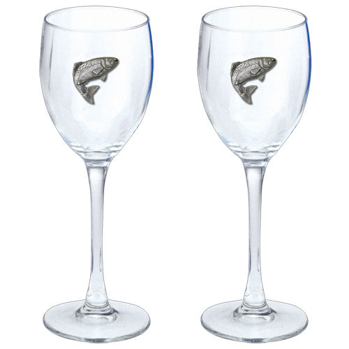 This is a set of two 12 ounce glass goblets with a fine pewter logo medallion bonded to the side. It could be used to serve water, wine or other beverages. Made in USA.