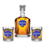 This 24-ounce glass decanter is embellished with a fine pewter casting. It comes with two Double Old Fashioned glasses. A great addition to any home bar! Made in USA.
