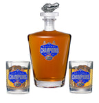 This is a set of a 25-ounce glass decanter with a fine pewter casting, 3D Topper, and two Double Old Fashioned Glasses. A great addition to any home bar! Made in USA.