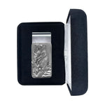 This money clip is made with super spring steel. It will hold one bill or a giant stack! The best looking and functioning clip you will ever own! The fine pewter detail is intricate. Comes with a velour hinged gift box. Made in USA.