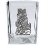 This 1.5 ounce square shot glass is highlighted with a fine pewter casting. Made in USA.