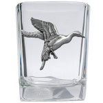 This 1.5 ounce square shot glass is highlighted with a fine pewter casting. Made in USA.