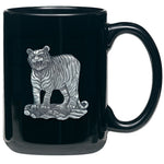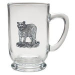 This coffee mug is decorated with a fine pewter casting. It is microwaveable and dishwasher safe with no heat cycle.. The glass coffee mug is 16 ounces, and the ceramic coffee mug is 15 ounces.