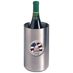 This is a wine chiller made of double-wall insulated stainless steel with a fine pewter logo medallion bonded to the front.