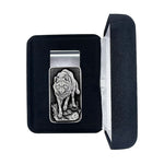 This money clip is made with super spring steel. It will hold one bill or a giant stack! The best looking and functioning clip you will ever own! The fine pewter detail is intricate. Comes with a velour hinged gift box. Made in USA.