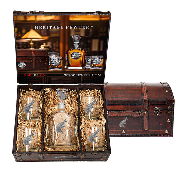 This Capitol Decanter Chest Set with 24 OZ Capitol Decanter and 4 Double Old-Fashioned Glasses Expertly Crafted Pewter Glass. A great addition to any home bar! Made in USA.