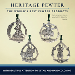 This fine pewter ornament is detailed on both sides. It comes with satin ribbon and in a window package. Use it on your tree, car mirror, or other applications! Made in USA.