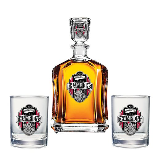This 24-ounce glass decanter is embellished with a fine pewter casting. It comes with two Double Old Fashioned glasses. A great addition to any home bar! Made in USA.
