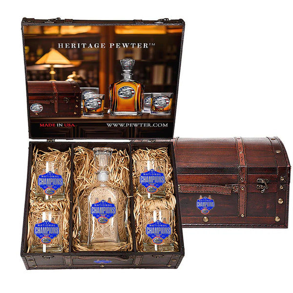 This Capitol Decanter Chest Set with 24 OZ Capitol Decanter and 4 Double Old-Fashioned Glasses Expertly Crafted Pewter Glass. A great addition to any home bar! Made in USA.