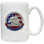 This coffee mug is decorated with a fine pewter casting. It is microwaveable and dishwasher safe with no heat cycle. This USA American Brand ceramic coffee mug is 15 ounces.